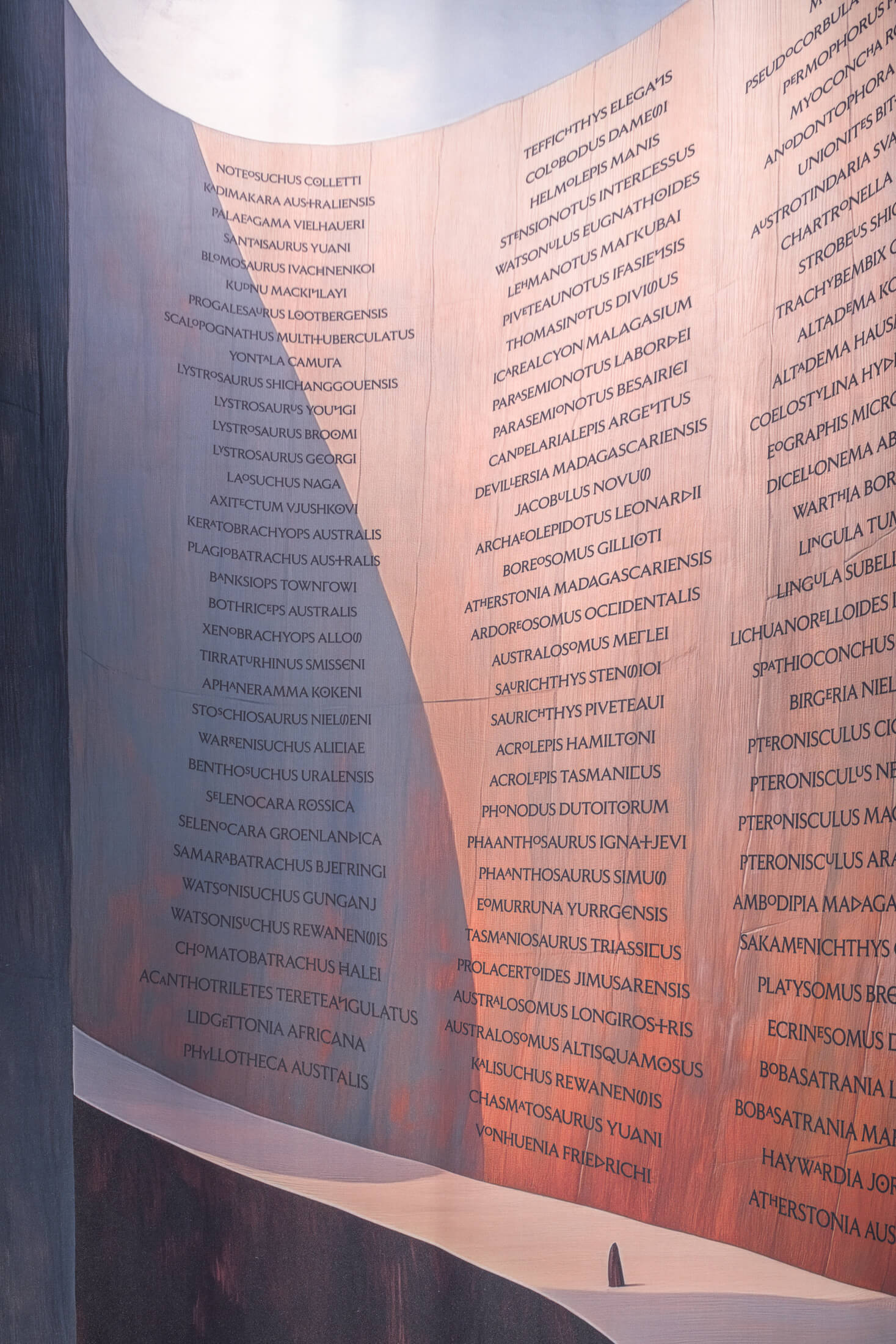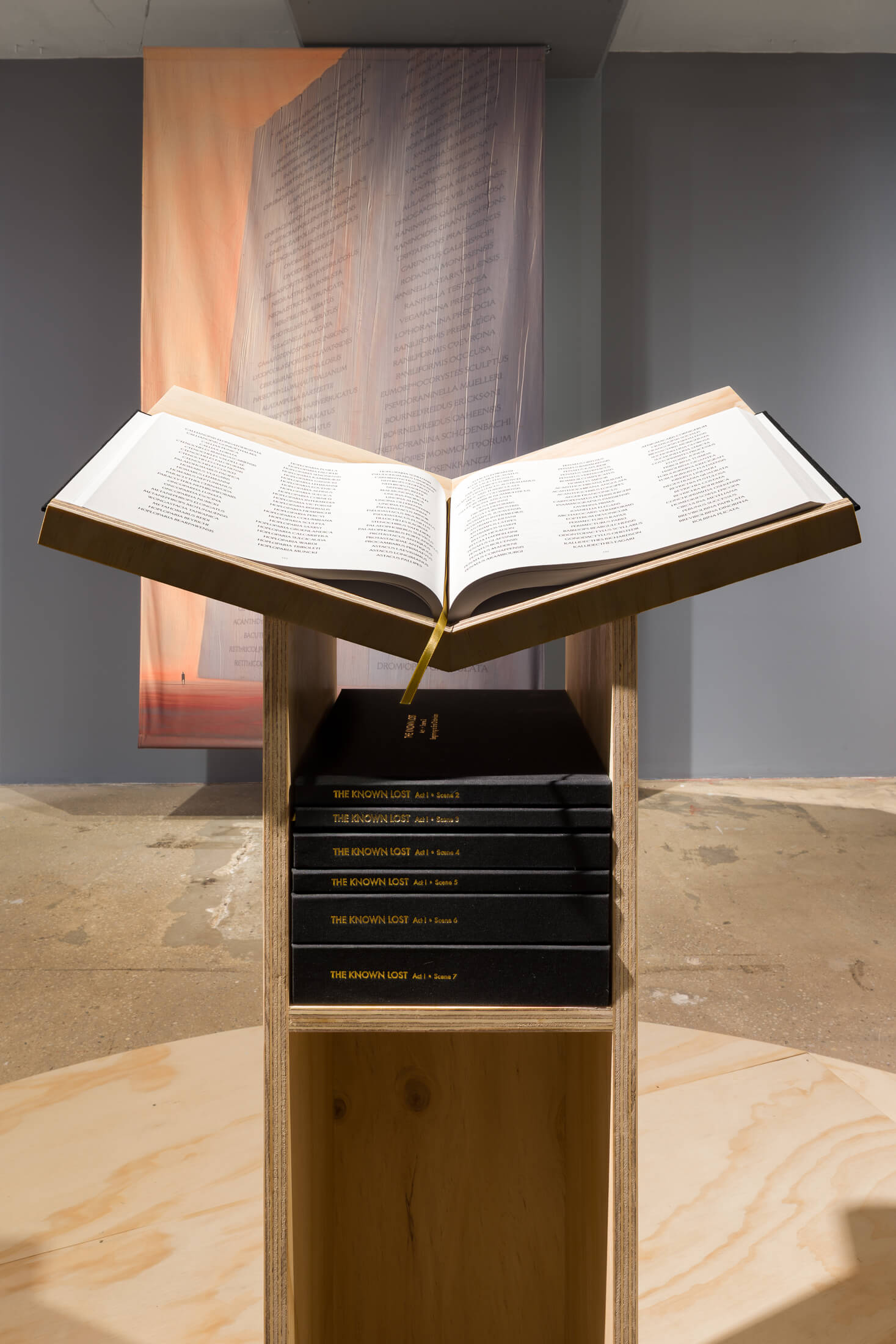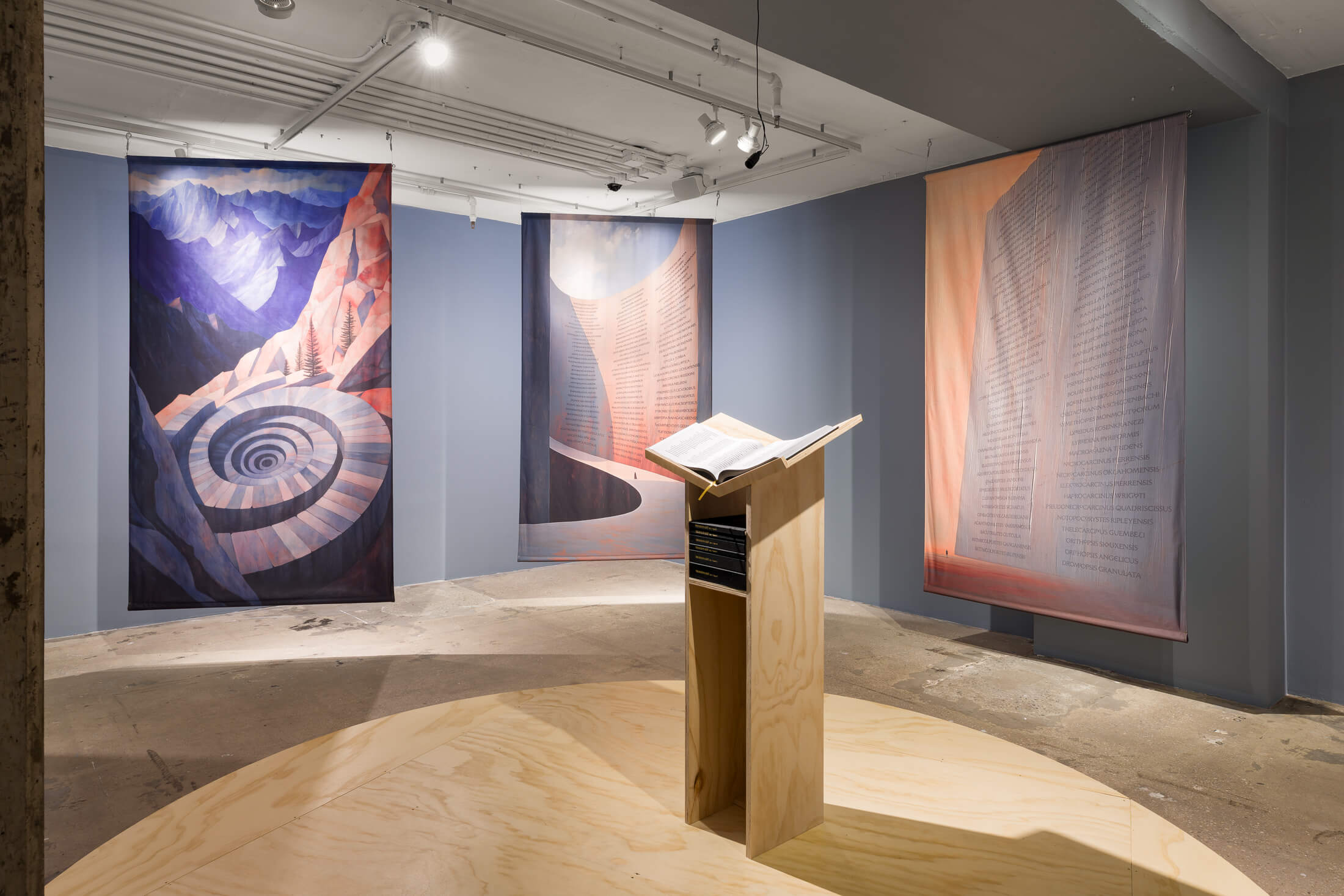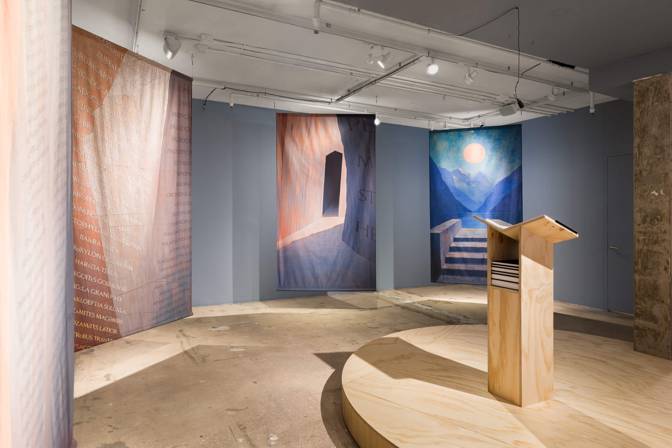 Presented in the lower-level gallery, the monument is rendered in a graphic style, reminiscent of early 20th century European Spiritualist painting, across seven cloth backdrops. In the center, a platform hosts a set of books containing a list of the scientific names of the 180,285 known extinct species from all kingdoms, compiled by Allado-McDowell from paleobiology databases. This list functions as both the libretto of the opera and the names to be engraved into the monument. While the list acknowledges and celebrates life, it also frames life as ephemeral. Visitors are invited to read or sing the species’ names over an original score by composer Derrick Skye. In doing so, they collectively rehearse and perform the first act of the opera, realizing the monument in the collective imagination – a foundational step towards its eventual construction.