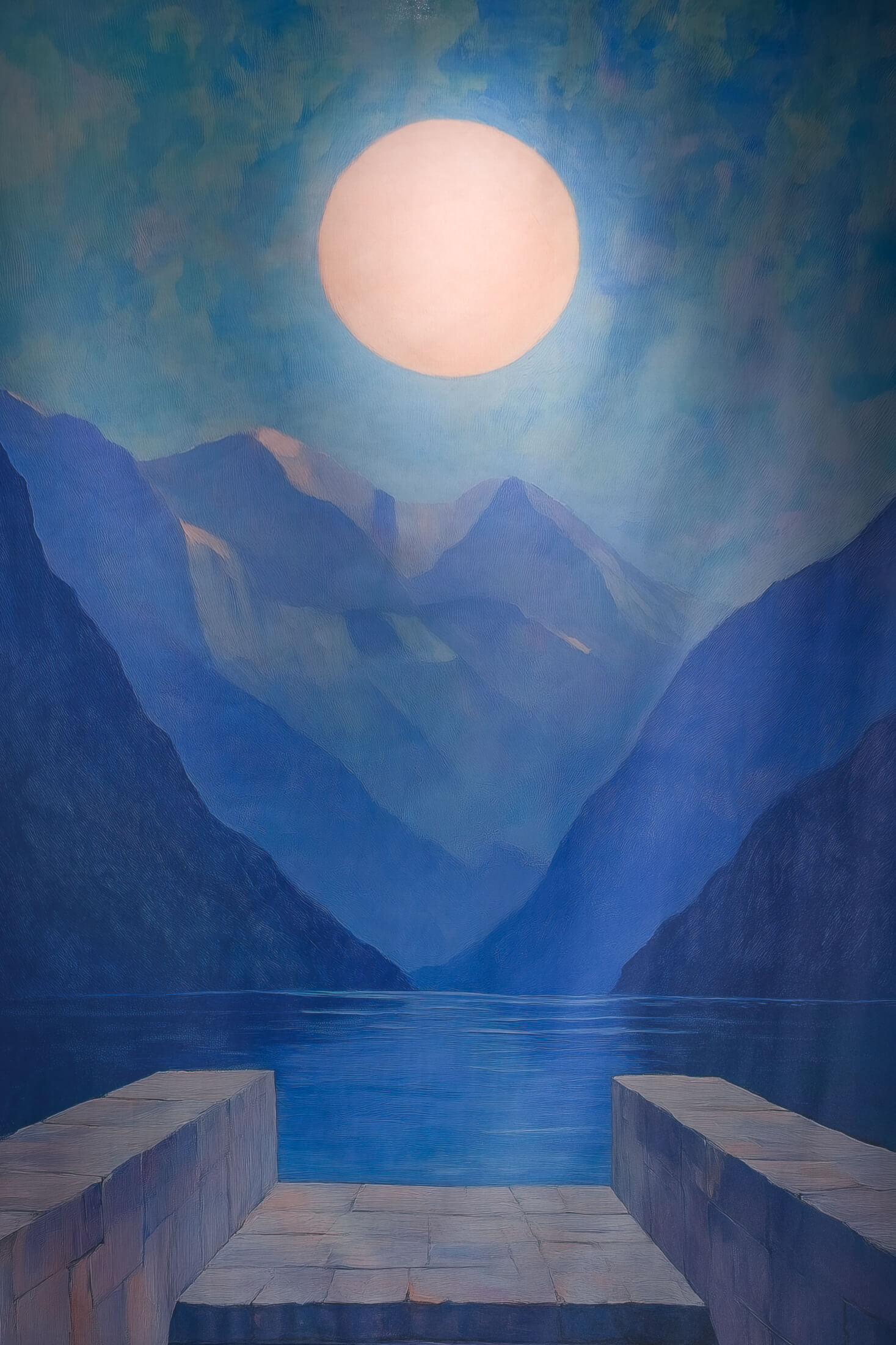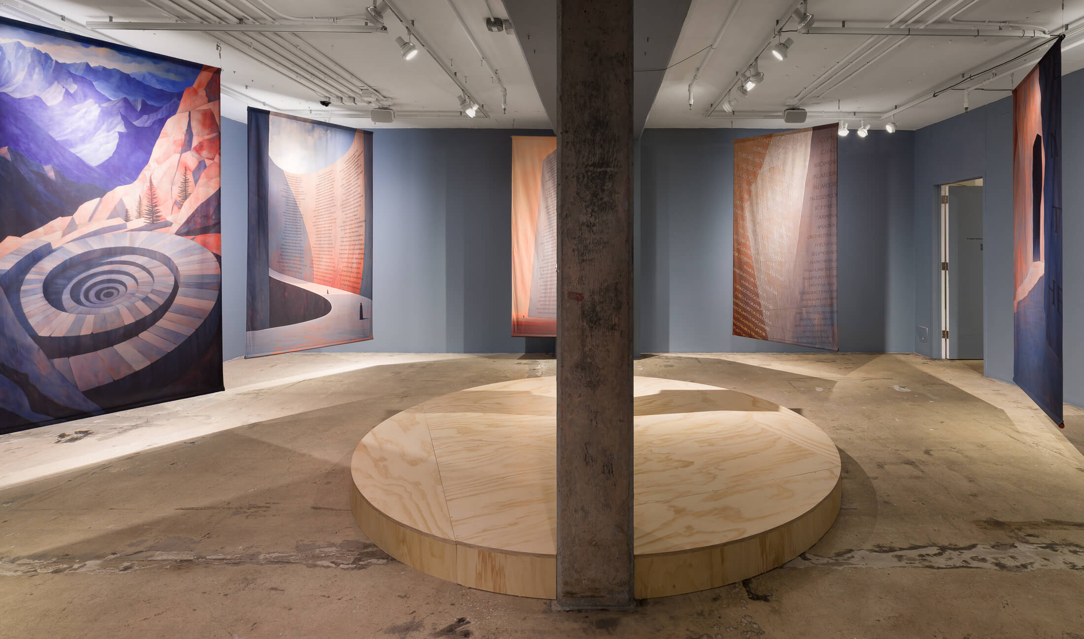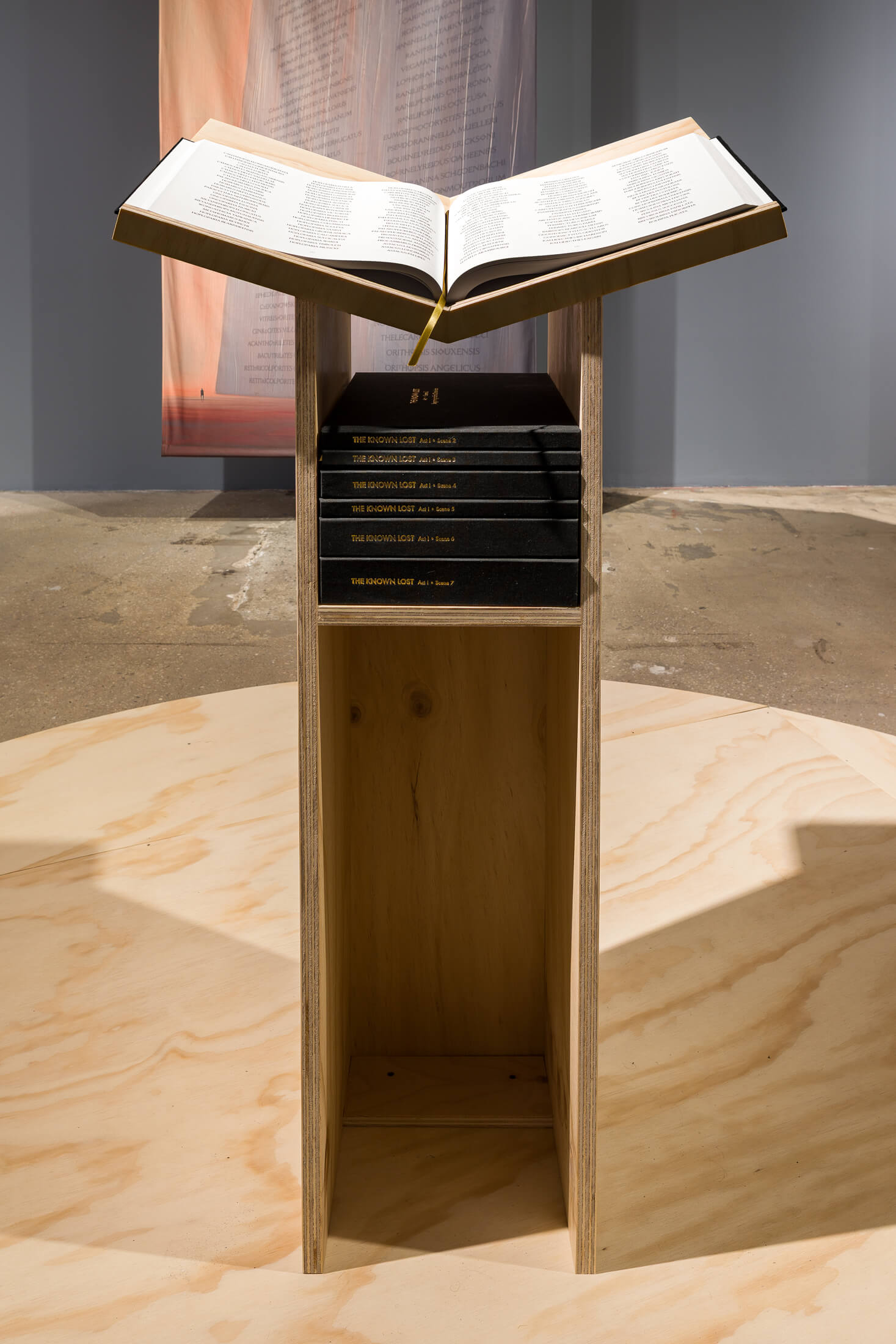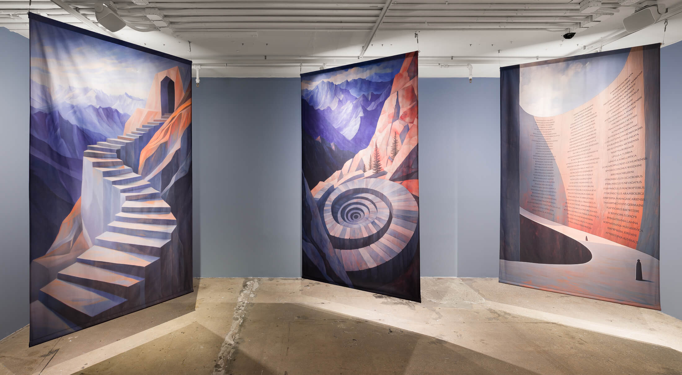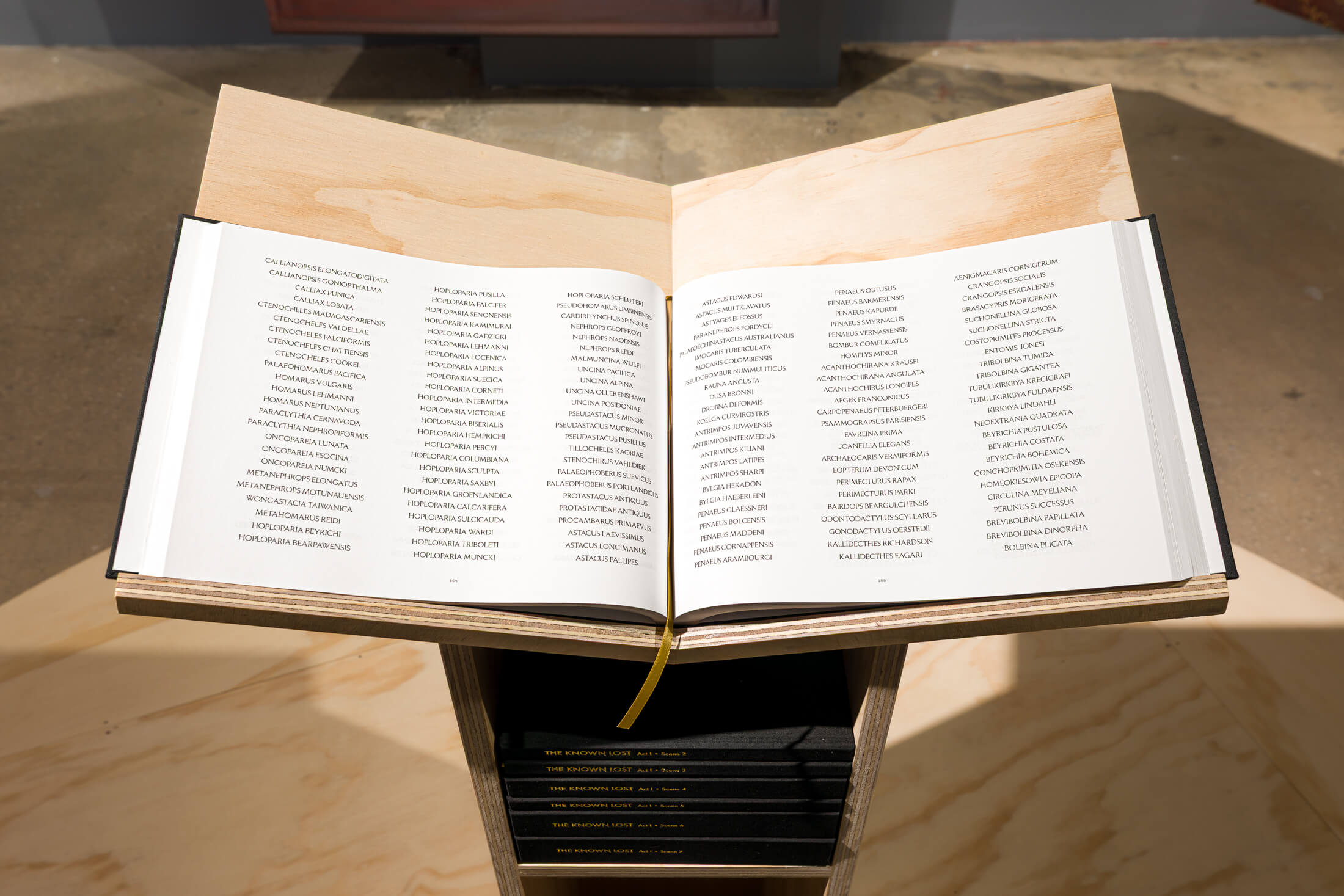 Presented in the lower-level gallery, the monument is rendered in a graphic style, reminiscent of early 20th century European Spiritualist painting, across seven cloth backdrops. In the center, a platform hosts a set of books containing a list of the scientific names of the 180,285 known extinct species from all kingdoms, compiled by Allado-McDowell from paleobiology databases. This list functions as both the libretto of the opera and the names to be engraved into the monument. While the list acknowledges and celebrates life, it also frames life as ephemeral. Visitors are invited to read or sing the species’ names over an original score by composer Derrick Skye. In doing so, they collectively rehearse and perform the first act of the opera, realizing the monument in the collective imagination – a foundational step towards its eventual construction.