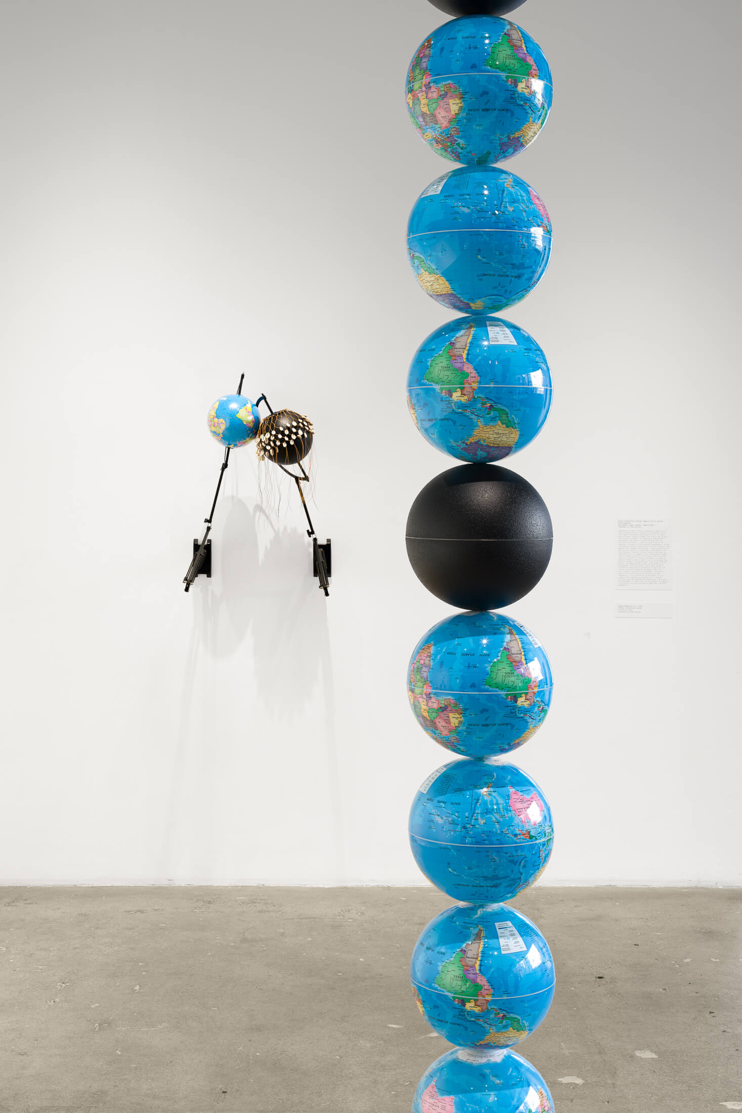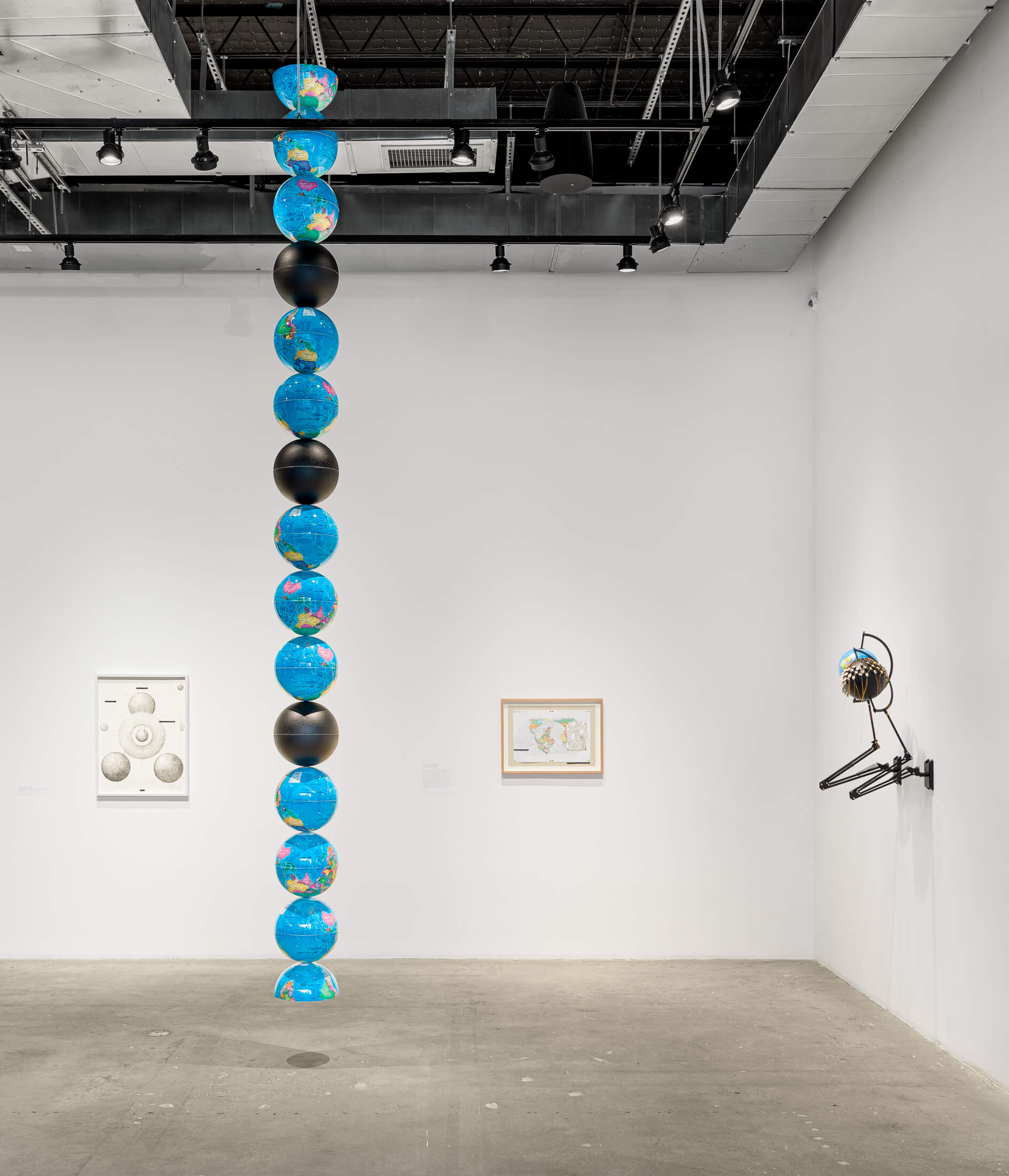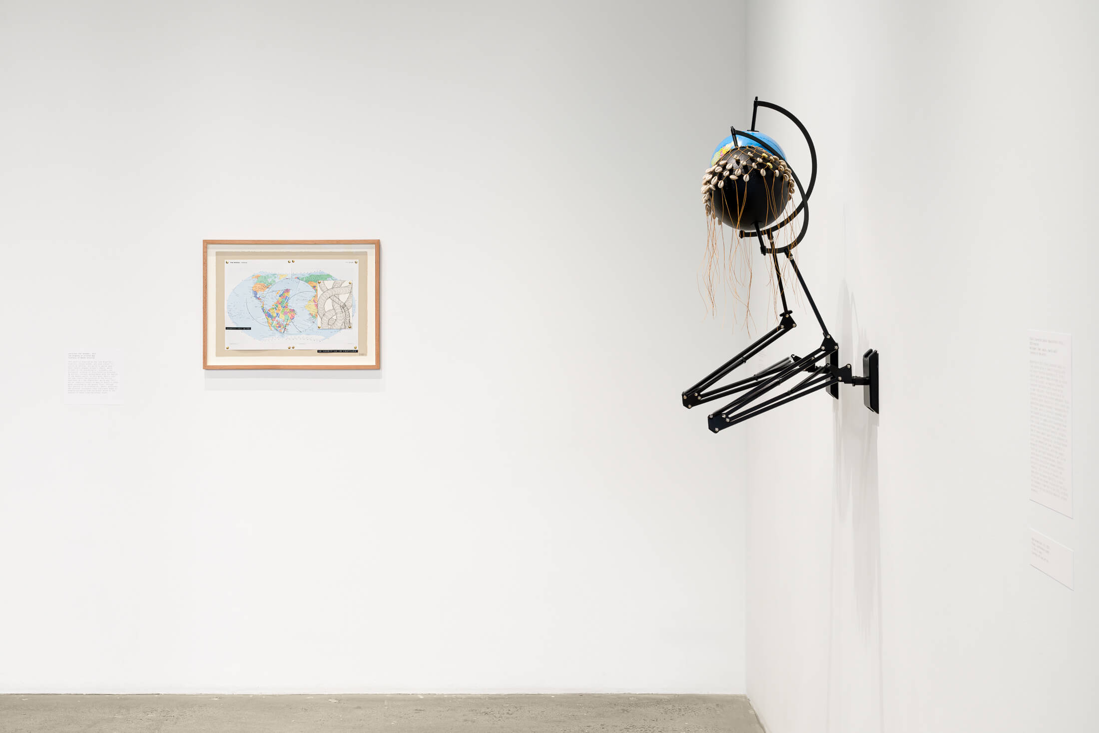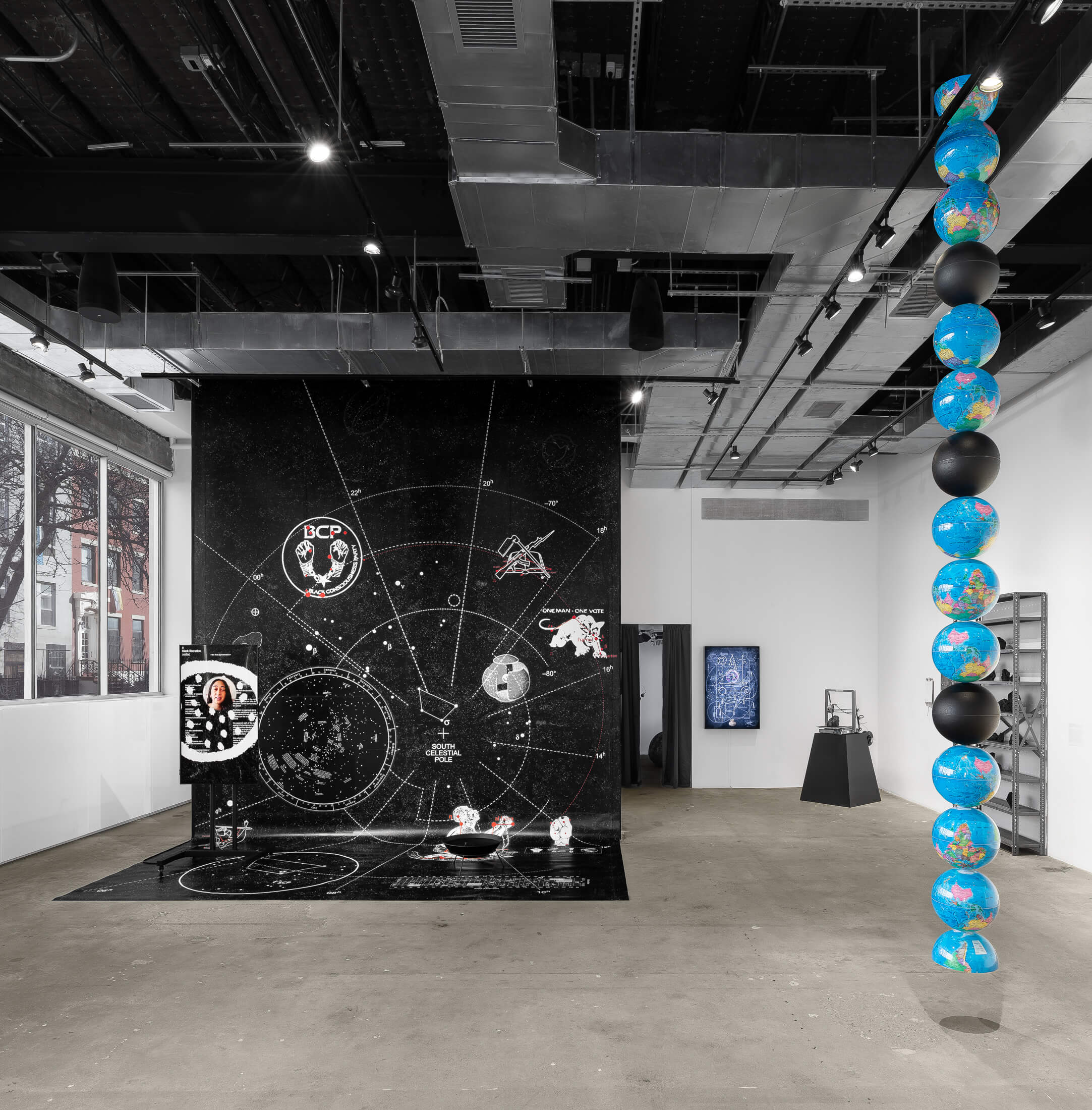 Featured on the ground floor at SI are the latest iterations of ongoing bodies of work that model the spatiotemporal antagonisms between the racialized, propertied world and heterogenous Black and Indigenous imaginaries that dynamically co-exist with, under, and against this world. Black Liberation Zodiac (Kgositsile’s Folly) (2022-ongoing) remaps the night sky across the ecliptic plane from the position of an observer located in the southern hemisphere. Presented alongside a video featuring interviews with an African astrophysicist and other interlocutors, the work is composed of a monumental infinity curve that substitutes the symbols of the standard Eurasian Zodiac constellation with iconography drawn from a global archive of militant and anti-capitalist Black liberation struggles. Moving from celestial to terrestrial realms, Isivivane (2023-ongoing), developed in conversation with geologists and geology museum curators, intervenes into discussions on restitution by creating digital and physical simulations of collected rock samples from various settler colonial contexts. Specifications for a Reverse Archaeology (2022-23) is comprised of a single-channel film, a lightbox diagram, and custom pillow seating inspired by digitized renderings of a sacred landscape in Southern Africa. Through the work, Dennis ruminates on geo-spiritual relations and conditions of landlessness, reimagining the extractivist instruments of archeological science for alternative, potentially liberatory purposes. Other works on the ground floor subject familiar representations of the globe to playful inversions, sequential multiplications, and culturally symbolic rearticulations, challenging universalizing Western scientific claims to planetary knowledge with the unruly suggestion of incessantly produced counter-cosmologies.