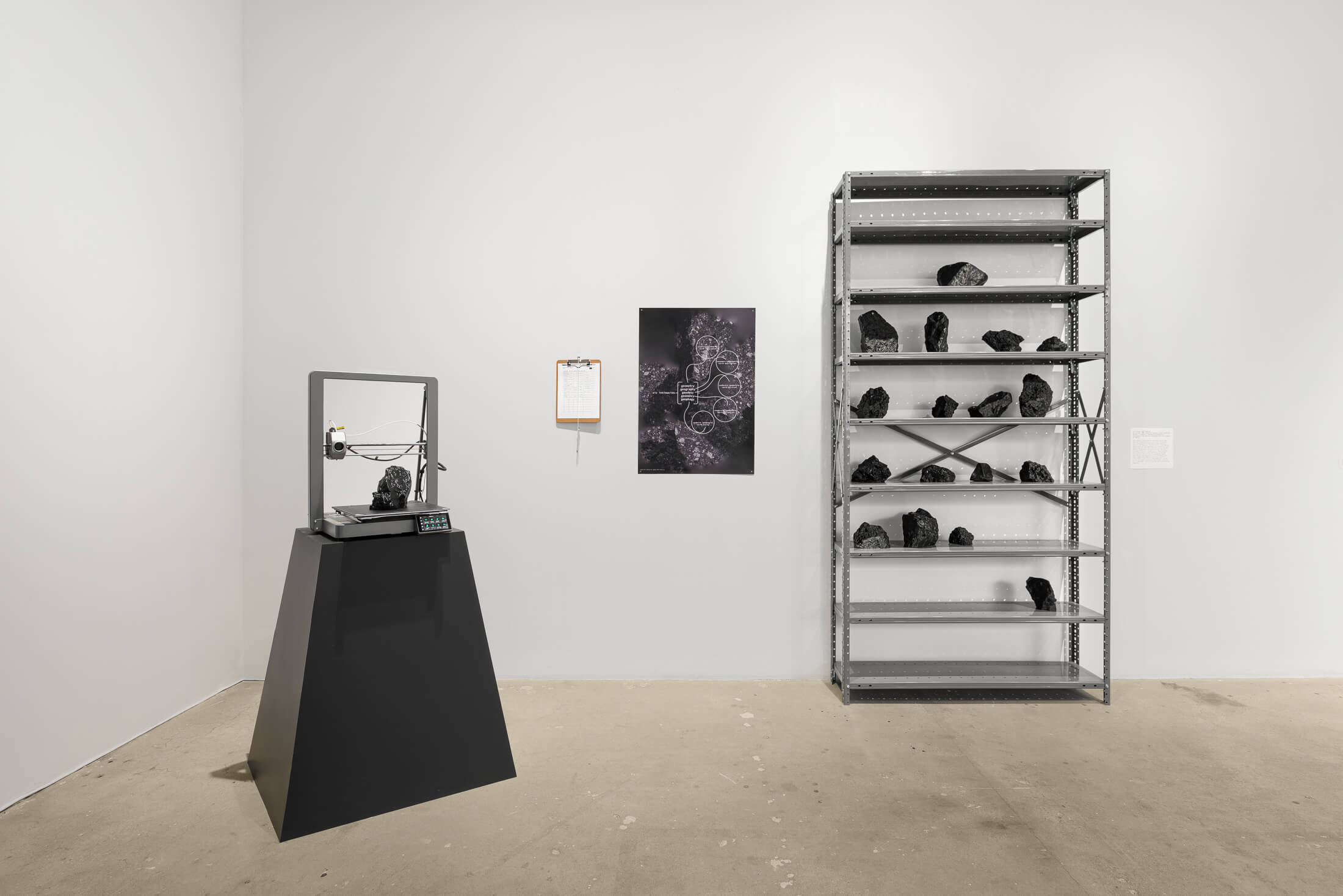 overturns departs from a pair of conceptual threads in the work of Jamaican philosopher Sylvia Wynter. Lending the exhibition its title, Dennis references Wynter’s call to develop a “new science” that combines the humanities and the natural sciences in order to overturn prevailing Western epistemes.[1] Dennis couples this ethic of disciplinary transgression with a reworking of Wynter’s theory of the “genres” of the human, which argues that the social, economic, and ecological inequities that pervade the global present are the result of the ongoing systemic “overrepresentation” of “Man,” a dominant Western bourgeois genre of being human.[2] For overturns, Dennis advances their notion of the “genres of the planet” to consider modernity’s figuration of the Earth as unified, transparent, and amenable to the proprietary drives of racial capital.