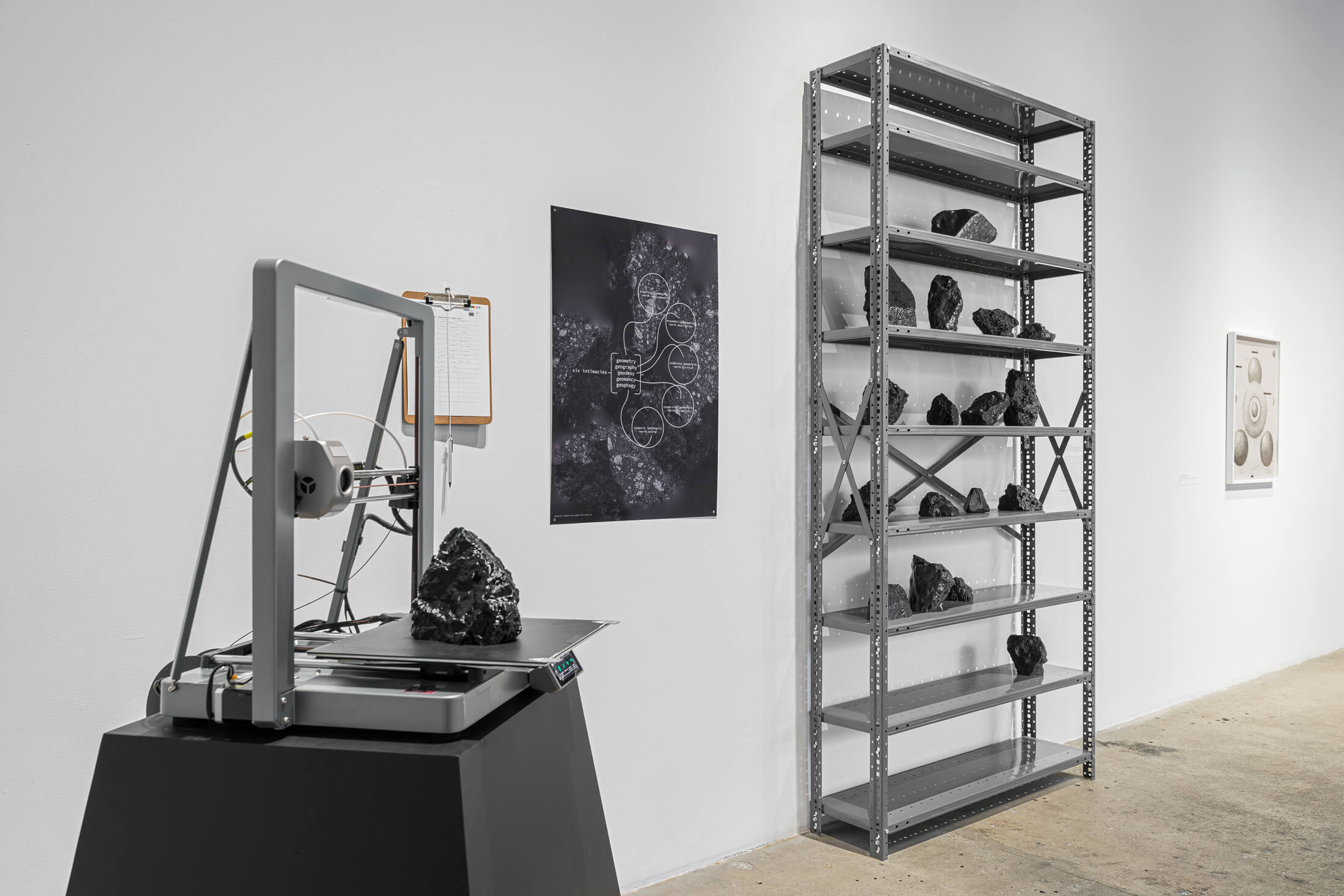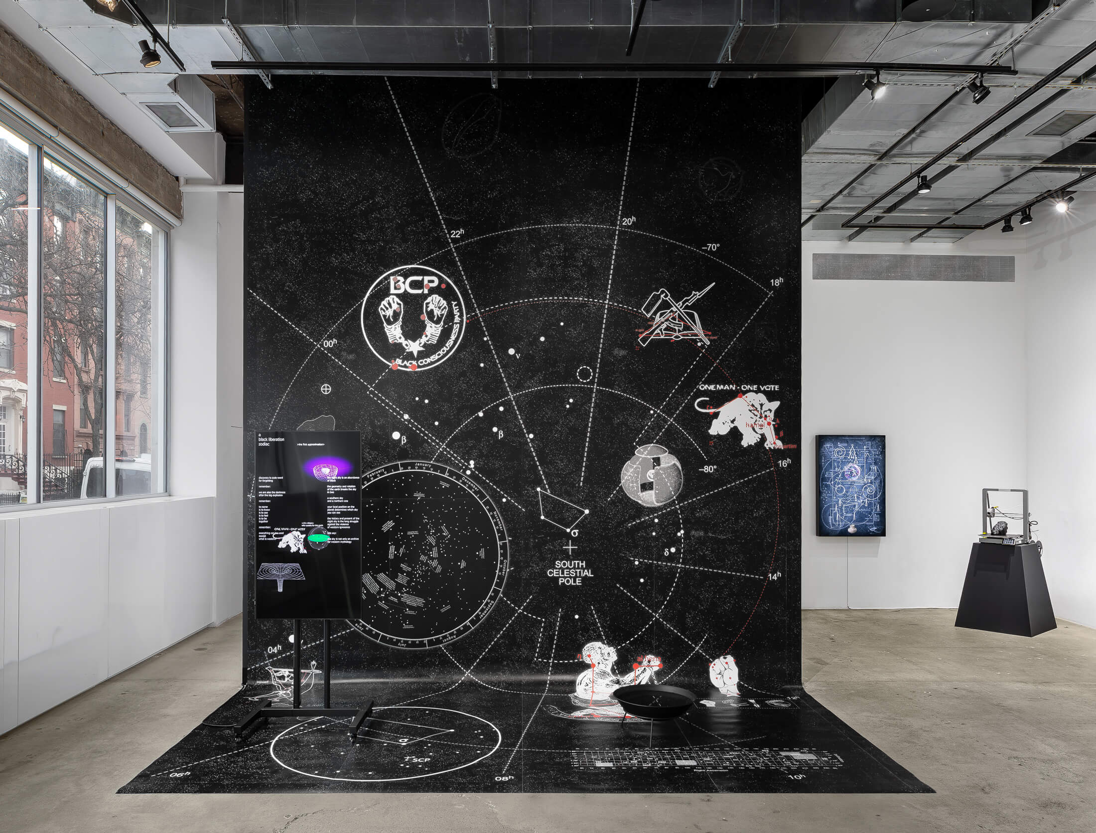 The works on the second floor form a pedagogical environment and rehearsal space to prepare viewers for the possible arrival of a decolonized planet. A series of thermal printer sculptures produce dialogues between South African anti-apartheid activist Steve Biko and a range of other bygone, anti-imperialist thinkers such as AmĂlcar Cabral, Toni Cade Bambara, and Malcolm X. Combining historiographic critique and poetic computation, each of the dialogues are generated by an algorithm that searches for a pair of words within the texts and speeches of these Black radical figures. Nearby, the newly commissioned wall diagram, recurse 4 a late planet (lush) (2024) utilizes African fractal geometries, mathematical abstractions, astronomical symbols, and lyrical annotations to reflect on the systemic logics that reproduce the world’s social hierarchies and exclusions. Over the course of the exhibition, a pair of specially designed shelves, inspired by library furniture, will gather written notes and reflections by visitors to SI.